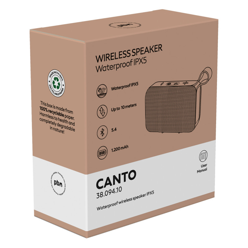 Vodoodbojni bežični zvučnik sa stepenom zaštite IPX5, namenjen korišćenju u različitim okruženjima - u zatvorenom prostoru, na otvorenom ili u pokretu. Omogućava reprodukciju zvuka snage 5 W i stabilnu bežičnu vezu, dok baterija velikog kapaciteta obezbeđuje dug radni vek. Zahvaljujući ručki za nošenje i robusnom dizajnu, pogodan je i kao praktičan promotivni proizvod. Isporučuje se u poklon kutiji sa uključenim Type-C kablom za punjenje. Ključne karakteristike: Bežični zvučnik • Snaga zvučnika 5 W • BT verzija 5.4 • Domet rada do 10 m • Punjiva baterija kapaciteta 1200 mAh • Vreme reprodukcije do 20 sata (70% jačine zvuka) • Vreme punjenja 2 h • IPX5 vodoodbojnost • Type-C kabl za punjenje uključen • Ručka za nošenje • Poklon kutija