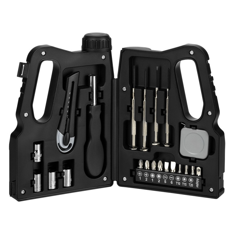 Materijal: nerđajući čelik (elementi), plastika (kutija) • Funkcije: skalpel, 2 ravna odvijača, 2 krstasta odvijača, metar, držač sa 4 izmenjiva nastavka, 10 uložaka • Plastična kutija sa drškom za nošenje • Poklon pakovanje