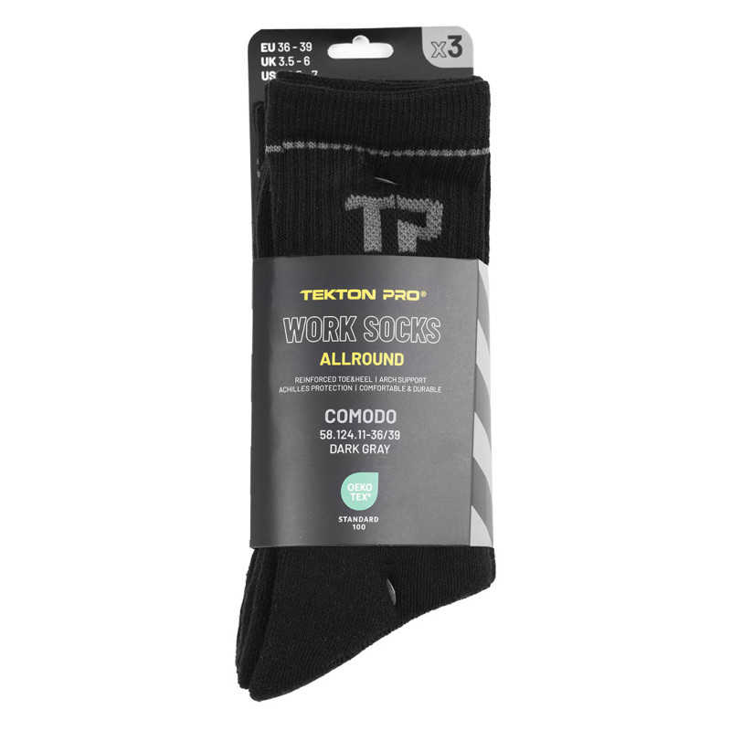 COMODO su radne čarape namenjene celogodišnjoj upotrebi i svakodnevnom nošenju u radnim uslovima sa povećanim opterećenjem stopala. Dizajnirane su da obezbede stabilnost, udobnost i dugotrajnost tokom intenzivnog rada. Izrađene su od mešavine materijala u sastavu 75% pamuk, 22% poliamid i 3% elastin, što omogućava dobru kombinaciju prirodne mekoće, otpornosti i elastičnosti. Konstrukcija uključuje ojačane zone u predelu pete i prstiju radi povećane otpornosti na habanje i produženog veka trajanja. Prozračna mrežasta struktura omogućava efikasnu ventilaciju i smanjuje zadržavanje vlage, dok integrisana potpora u zoni luka stopala doprinosi stabilnosti i smanjenju zamora tokom dugotrajnog rada. Čarape poseduju OEKO-TEX sertifikat, što potvrđuje da su materijali bez štetnih supstanci i pogodni za direktan kontakt sa kožom. Isporučuju se u pakovanju od tri para i namenjene su za industriju, građevinu, logistiku, servise i druga radna okruženja gde su pouzdanost, komfor i trajnost ključni zahtevi. Ključne karakteristike: Radne čarape • Sirovinski sastav: 75% pamuk, 22% poliamid, 3% elastin • Celogodišnja upotreba • Ojačane zone (peta i prsti) • Prozračna mrežasta struktura • Potpora luka stopala • Smanjenje zamora • Pakovanje: 3 para • OEKO-TEX sertifikat