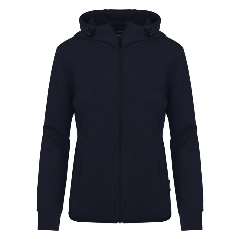 Ženska dukserica sa kapuljačom i punim rajsferšlusom • Sirovinski sastav: poliester, reciklirani poliester, viskoza, elastin • Gramatura: 300 g/m² • Atletska konstrukcija • Elastičan i stabilan materijal • Mekana i prijatna na dodir • Održivi sastav • Podesiva kapuljača • Diskretni prednji džepovi sa skrivenim otvaranjem • Elastične paspule na rukavima i dnu • Pogodna za aktivna radna i promotivna okruženja • Dostupna u muškoj verziji