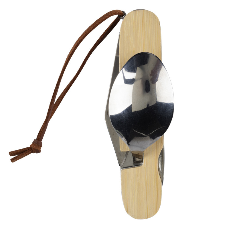nerđajući čelik (elementi), bambus (drška) • Funkcije: kašika, viljuška, nož, otvarač za flaše, otvarač za vino, razvijač • Vezica za kačenje i nošenje • Poklon