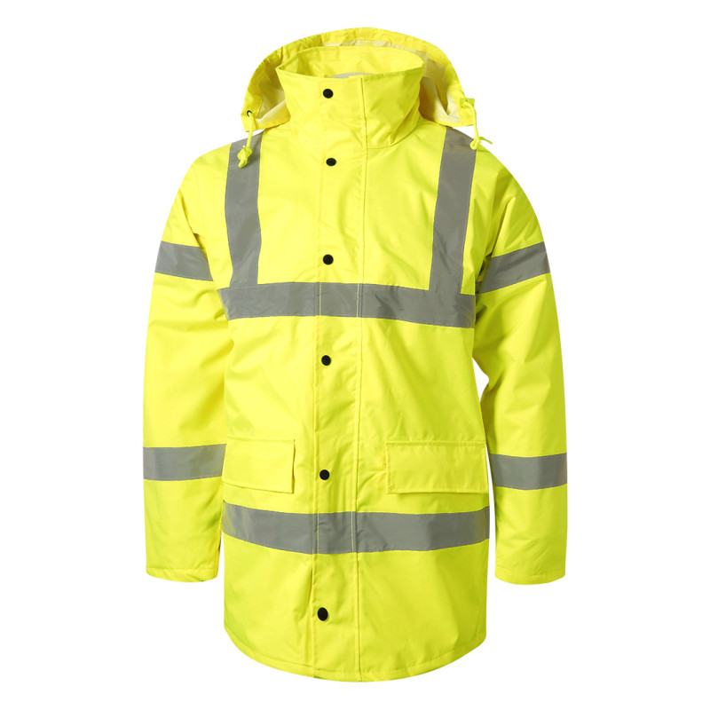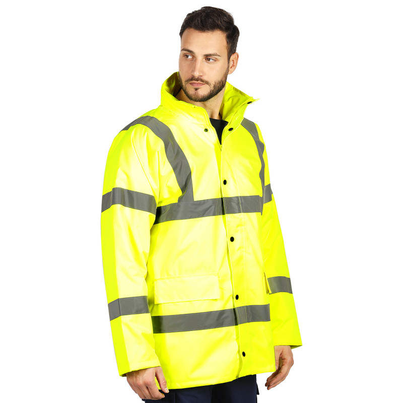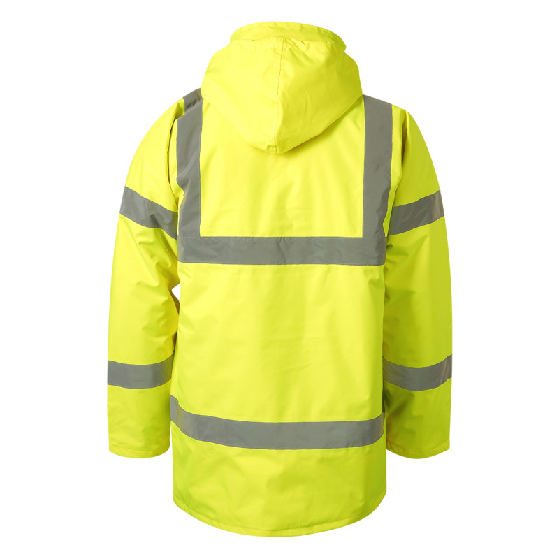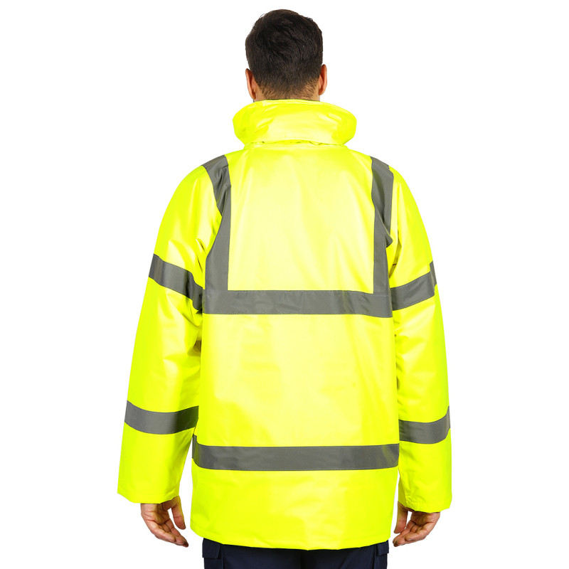 Sigurnosna zimska jakna visoke vidljivosti • 100% poliester sa PU premazom • Postava 100% najlon • Vodootporna i vetrootporna • Fluorescentna boja • Reflektivne trake visoke vidljivosti • Integrisana skidiva kapuljača • Dvosmerni rajsferšlus sa zaštitnim preklopom • Ranfle na rukavima • Višestruki džepovi • Skriveni rajsferšlus za štampu • EN ISO 20471 • CE sertifikat