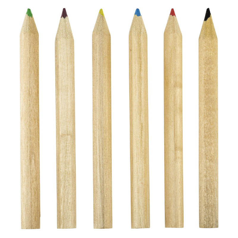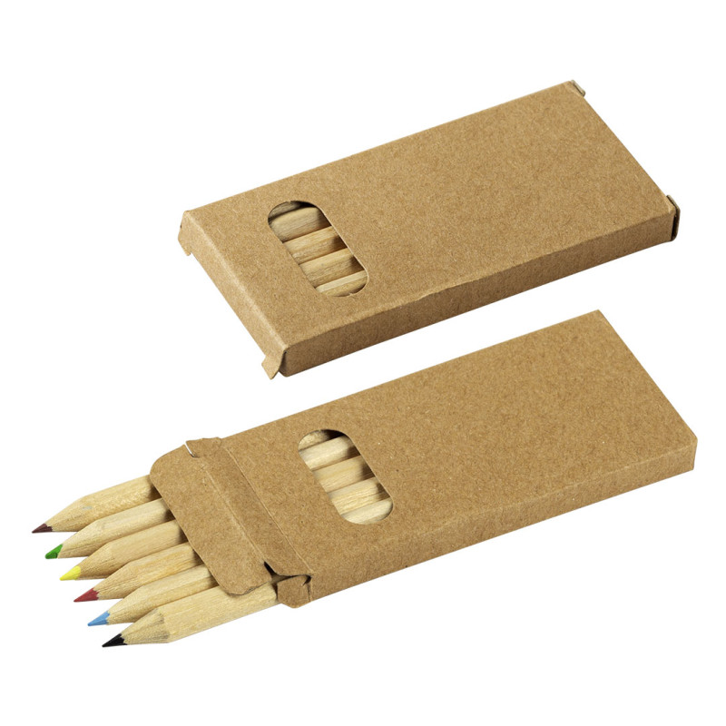 Set od 6 drvenih bojica upakovanih u kraft kartonsko pakovanje sa malim ovalnim otvorom na prednjoj strani, koji omogućava pregled sadržaja bez otvaranja pakovanja. Bojice imaju heksagonalno telo sa prirodnom završnicom, što obezbeđuje udobno držanje i stabilnost tokom crtanja. Praktičan izbor za školu i promotivne aktivnosti.