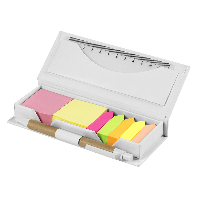 Set za beleške • Reciklirani karton • 110 samolepljivih papirića u dve boje • 110 mini samolepljivih papirića u obliku strelice (5 boja) • Lenjir 12 cm • Hemijska olovka od recikliranog kartona sa plavim mastilom • Prenosiv i kompaktan dizajn • Ekološki proizvod • Tema: Back to School • Jedan od najprodavaniji