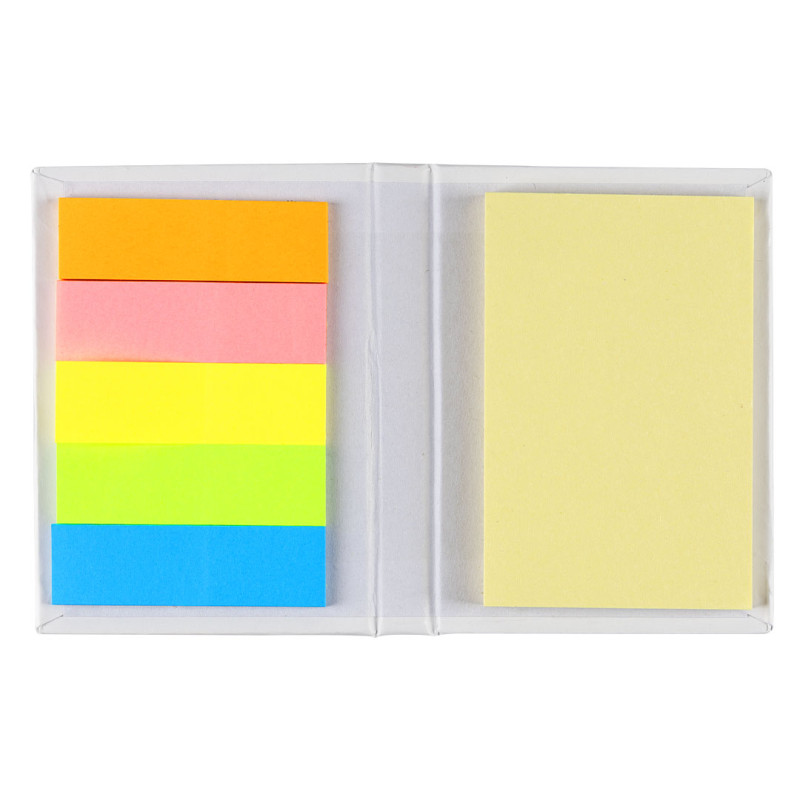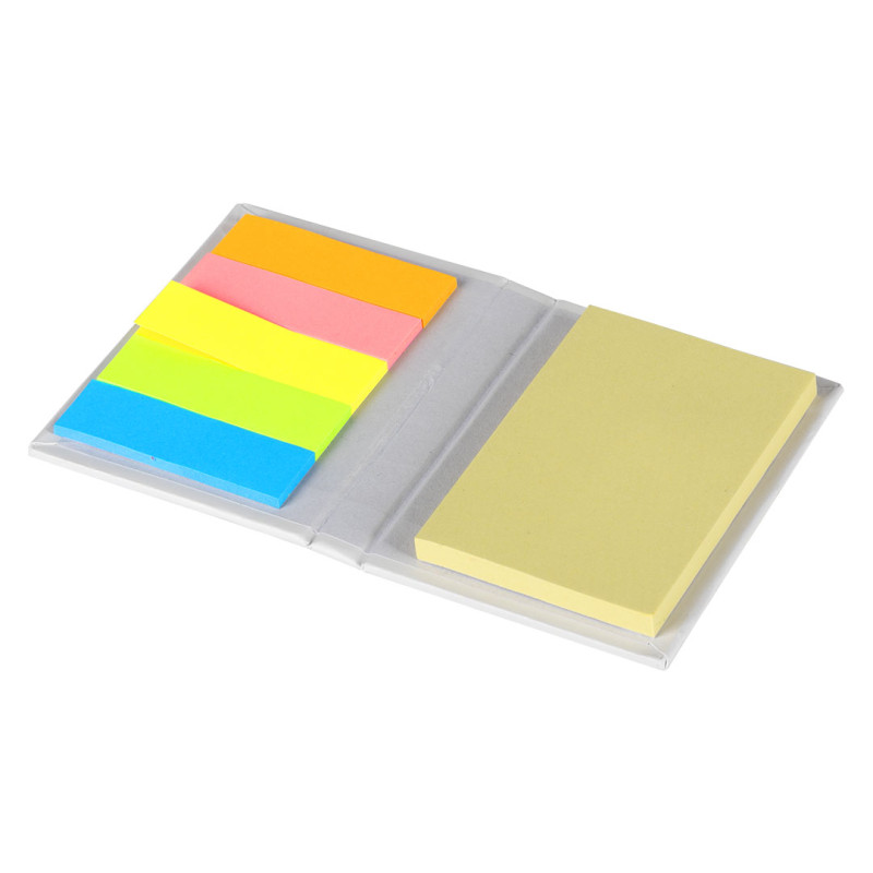 Set za beleške • Korice od recikliranog papira i kartona • 25 žutih samolepljivih papirića srednje veličine • 125 mini samolepljivih papirića (25 po boji) • Boje: narandžasta, roze, žuta, zelena, plava • Ekološki materijali • Ekonomičan i praktičan format • Pogodno za školu, posao i promotivnu upotrebu
