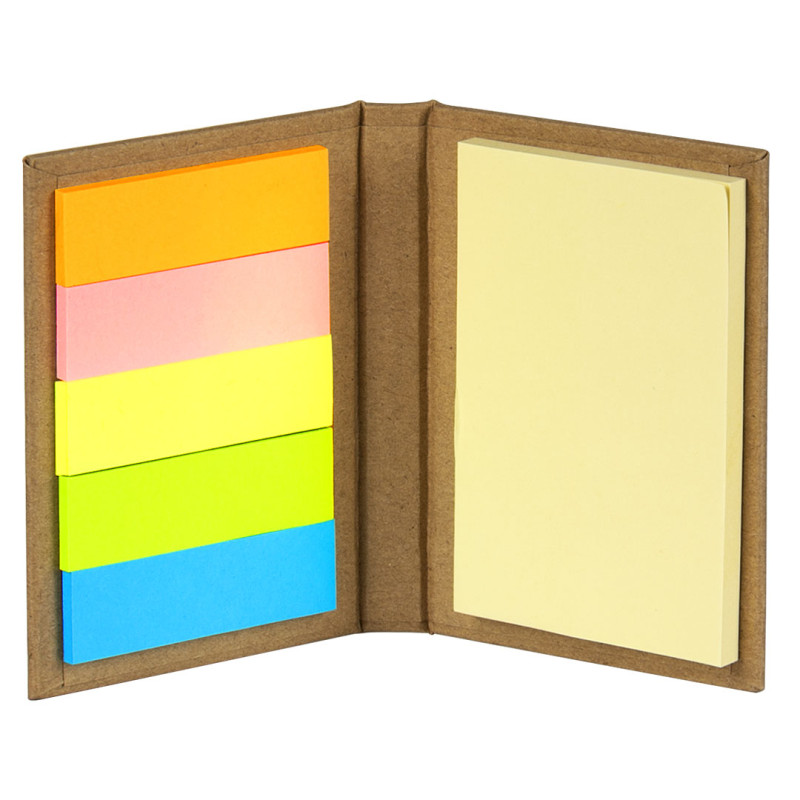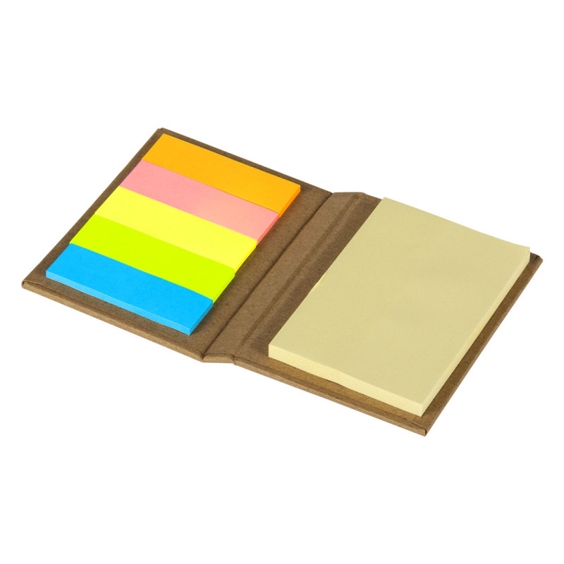 Set za beleške • Korice od recikliranog papira i kartona • 25 žutih samolepljivih papirića srednje veličine • 125 mini samolepljivih papirića (25 po boji) • Boje: narandžasta, roze, žuta, zelena, plava • Ekološki materijali • Ekonomičan i praktičan format • Pogodno za školu, posao i promotivnu upotrebu