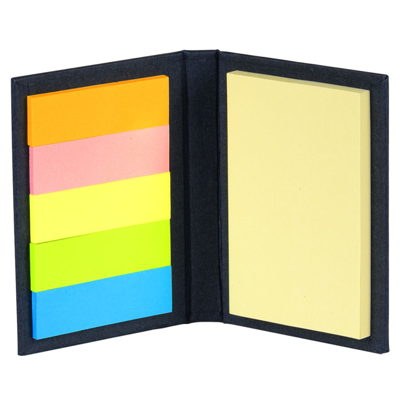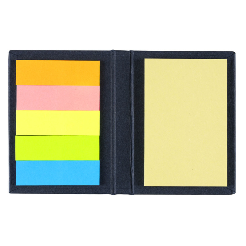 Set za beleške • Korice od recikliranog papira i kartona • 25 žutih samolepljivih papirića srednje veličine • 125 mini samolepljivih papirića (25 po boji) • Boje: narandžasta, roze, žuta, zelena, plava • Ekološki materijali • Ekonomičan i praktičan format • Pogodno za školu, posao i promotivnu upotrebu
