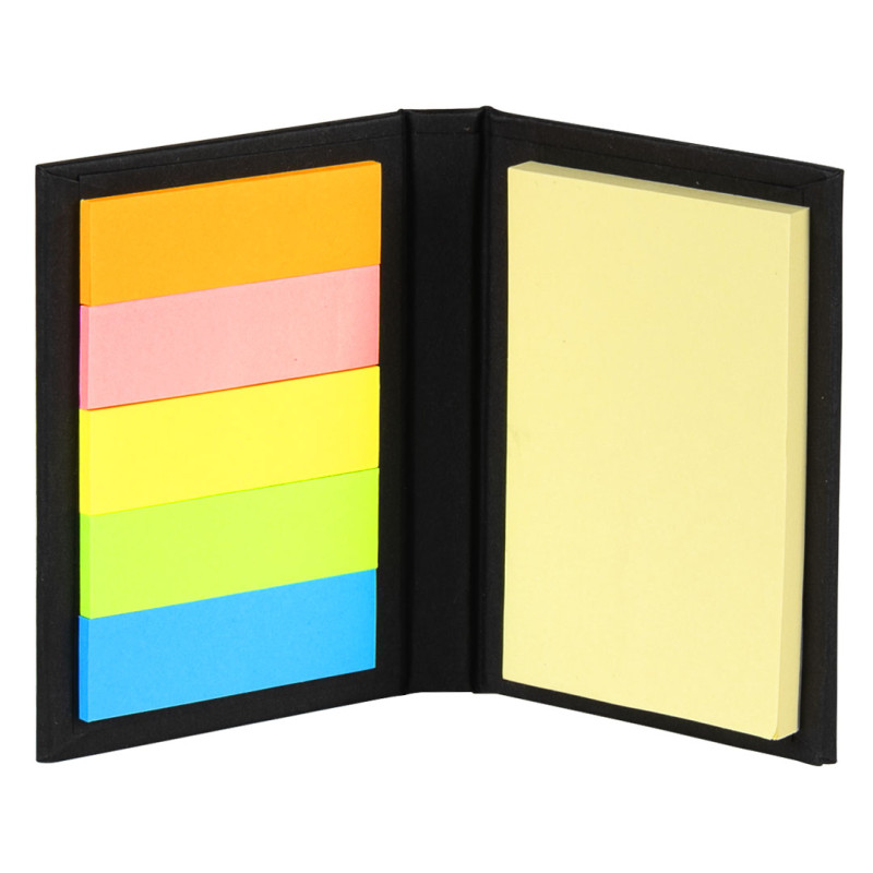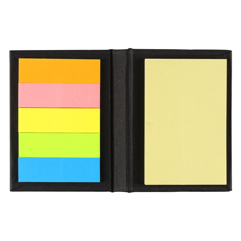 Set za beleške • Korice od recikliranog papira i kartona • 25 žutih samolepljivih papirića srednje veličine • 125 mini samolepljivih papirića (25 po boji) • Boje: narandžasta, roze, žuta, zelena, plava • Ekološki materijali • Ekonomičan i praktičan format • Pogodno za školu, posao i promotivnu upotrebu
