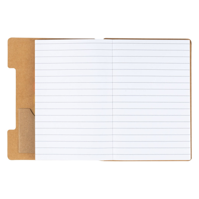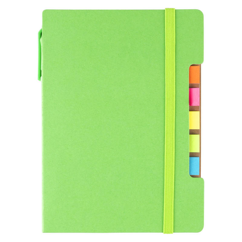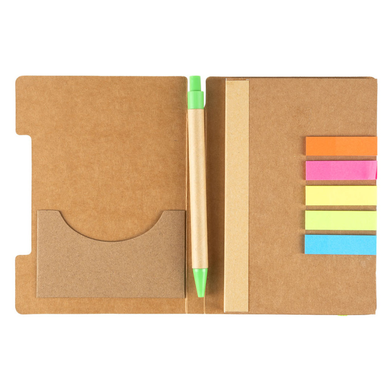 Funkcionalan set za beleške namenjen organizaciji obaveza u školi, kancelariji ili svakodnevnoj upotrebi. Sadrži 70 listova sa linijama, samolepljive papiriće u više boja i hemijsku olovku sa recikliranim delovima i plavim mastilom. Dodatni džep na unutrašnjoj strani korice omogućava praktično odlaganje sitnih dokumenata, dok elastična traka obezbeđuje sigurno zatvaranje. Dostupan u 7 boja, pogodan i za promotivne kampanje. Ključne karakteristike: Set za beleške • 70 listova sa linijama • 100 samolepljivih papirića (20 po boji) • Boje: roze, narandžasta, žuta, zelena, plava • Hemijska olovka sa recikliranim delovima sa plavim mastilom • Unutrašnji džep u korici • Elastična traka za zatvaranje • Dostupan u 7 boja
