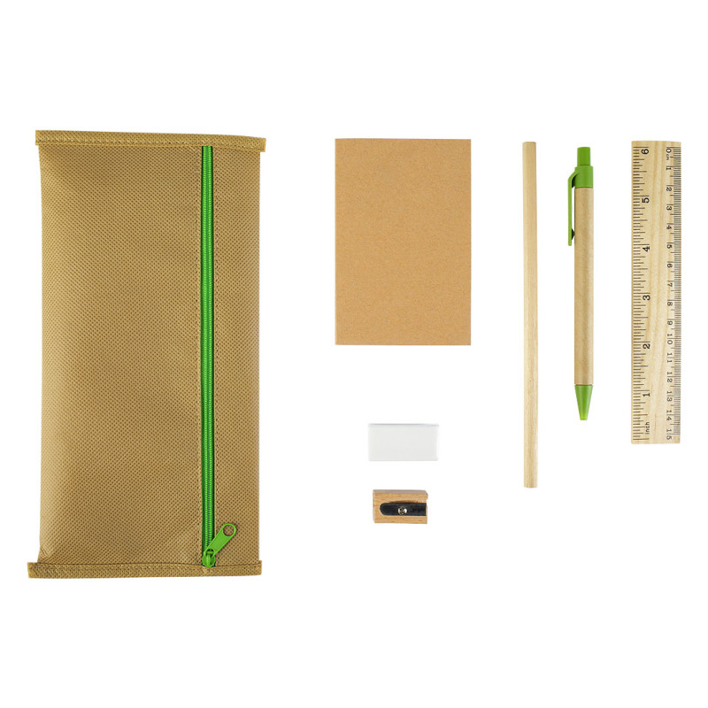 Praktičan set za pisanje i crtanje, idealan za školu, kancelariju ili promotivne aktivnosti. Set sadrži pernicu, mali notes sa praznim belim listovima, drveni lenjir dužine 15 cm, drvenu olovku, hemijsku olovku sa plavim mastilom, gumicu za brisanje i drveni zarezač. Svi elementi su uredno upakovani u pernicu, čiji je rajsferšlus usklađen u boji sa detaljima hemijske olovke.