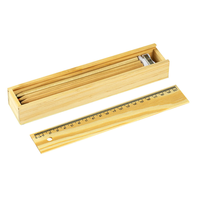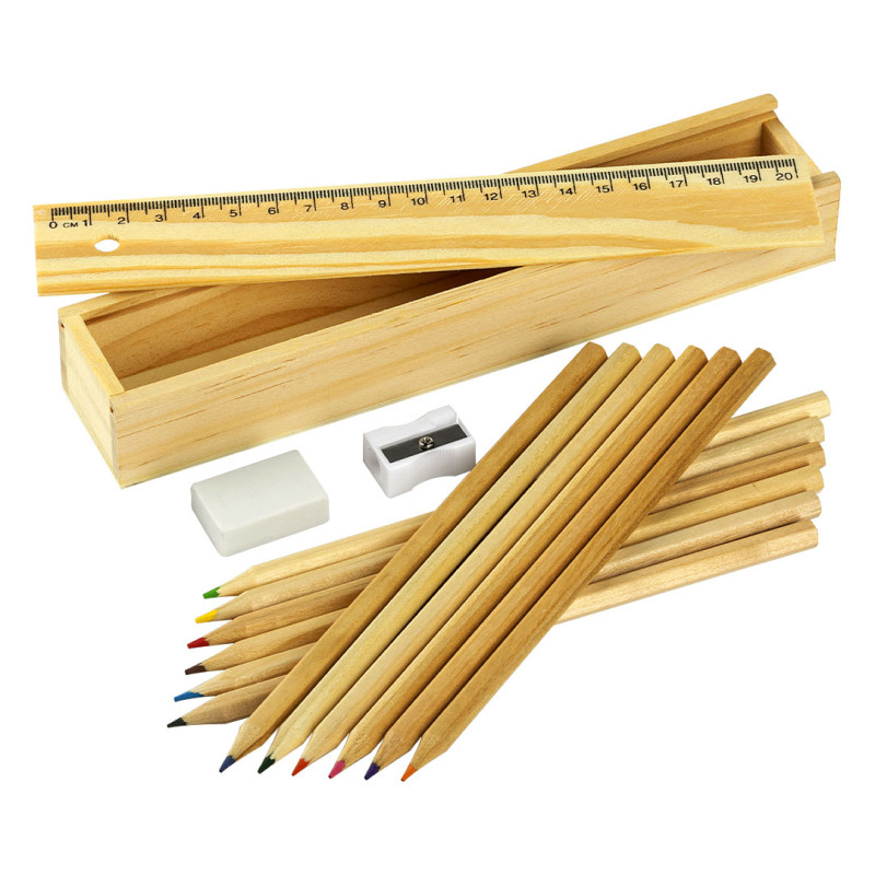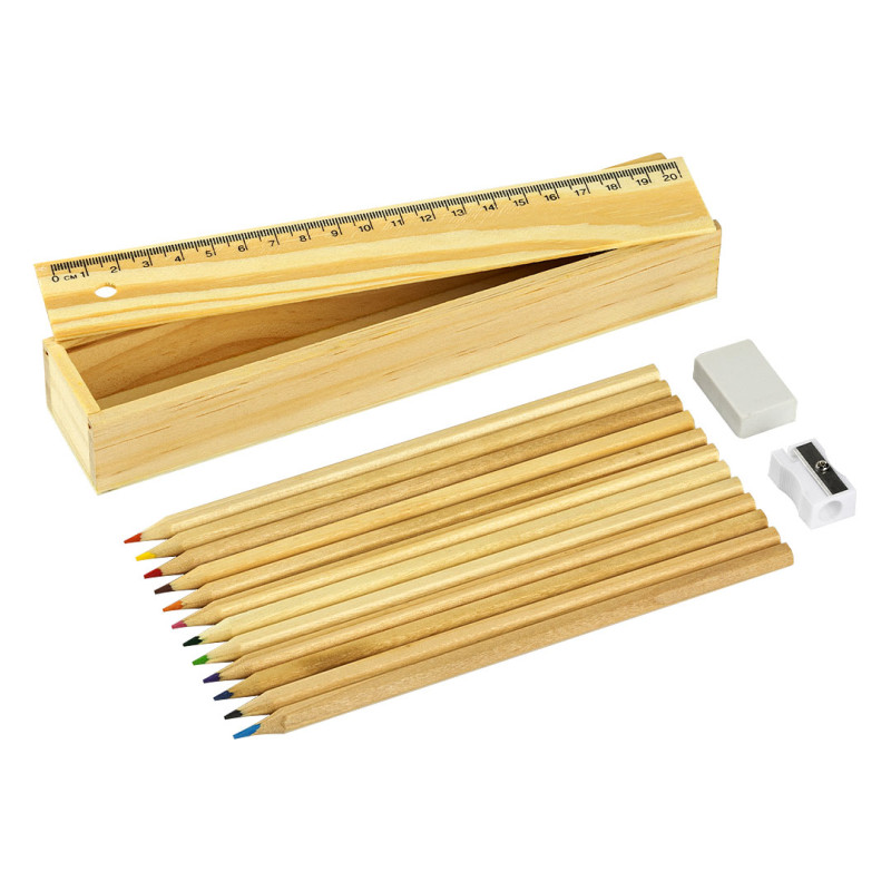 Kompletan set za crtanje, idealan za školu, radionice i promotivne poklone. Set sadrži 12 drvenih bojica sa heksagonalnim telom i prirodnom završnicom, lenjir dužine 20 cm, gumicu za brisanje i zarezač. Sve je upakovano u praktičnu drvenu kutijicu sa poklopcem koji se lako skida i vraća, čineći set urednim i dugotrajnim rešenjem za svakodnevnu upotrebu.