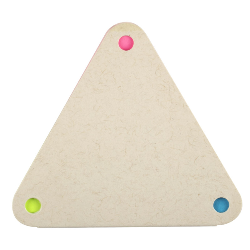 Set za beleške u obliku trougla, izrađen od recikliranog kartona ambalaže za mleko, namenjen brzoj organizaciji zadataka i obeležavanju važnih informacija. Čvrsta podloga pruža stabilnost pri pisanju, dok samolepljivi papirići u bež i neon bojama omogućavaju lako snalaženje u beleškama. Originalan oblik i jarke boje čine ovaj set upečatljivim promotivnim poklonom za kancelariju, školu ili svakodnevnu upotrebu. Ekološki proizvod.
