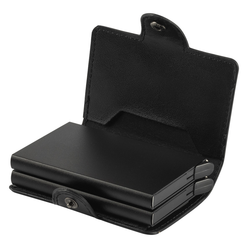 Novčanik sa RFID zaštitom, namenjen sigurnom čuvanju kartica i zaštiti podataka od neovlašćenog očitavanja. Unutrašnjost uključuje aluminijumski držač za kartice presvučen eko kožom, sa kapacitetom od 9 do 14 kartica. Pop-up mehanizam omogućava brzo i jednostavno izvlačenje kartica, dok dva odeljka pružaju dodatnu praktičnost. Model sadrži i pregradu za gotovinu, kao i dve dodatne pregrade za kartice. Dolazi u poklon pakovanju, pogodan i kao poslovni ili promotivni poklon.