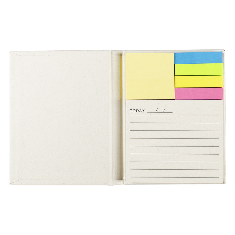 Set za beleške • Reciklirani karton od ambalaže za mleko • 70 stranica za beleške sa poljima za datum • 70 žutih samolepljivih papirića • 4 bloka po 70 fluorescentnih papirića (plava, zelena, žuta, roze) • Elastična traka za zatvaranje • Ekološki koncept • Pogodno za planiranje i organizaciju