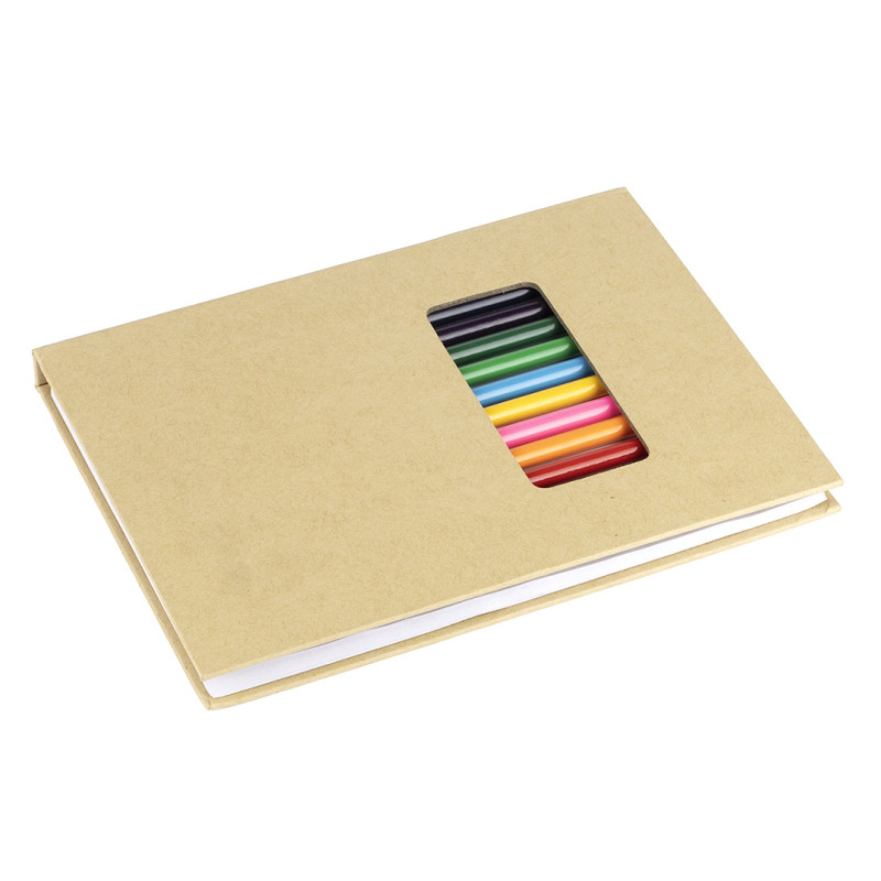 Set za crtanje koji sadrži 12 bojica i blok sa 70 praznih belih listova, namenjen kreativnim aktivnostima dece i učenika. Korice su izrađene od kartona, a prednja strana ima otvor koji omogućava brz pregled dela dostupnih boja bez otvaranja pakovanja. Praktičan izbor za školu, radionice i promotivne kampanje.
