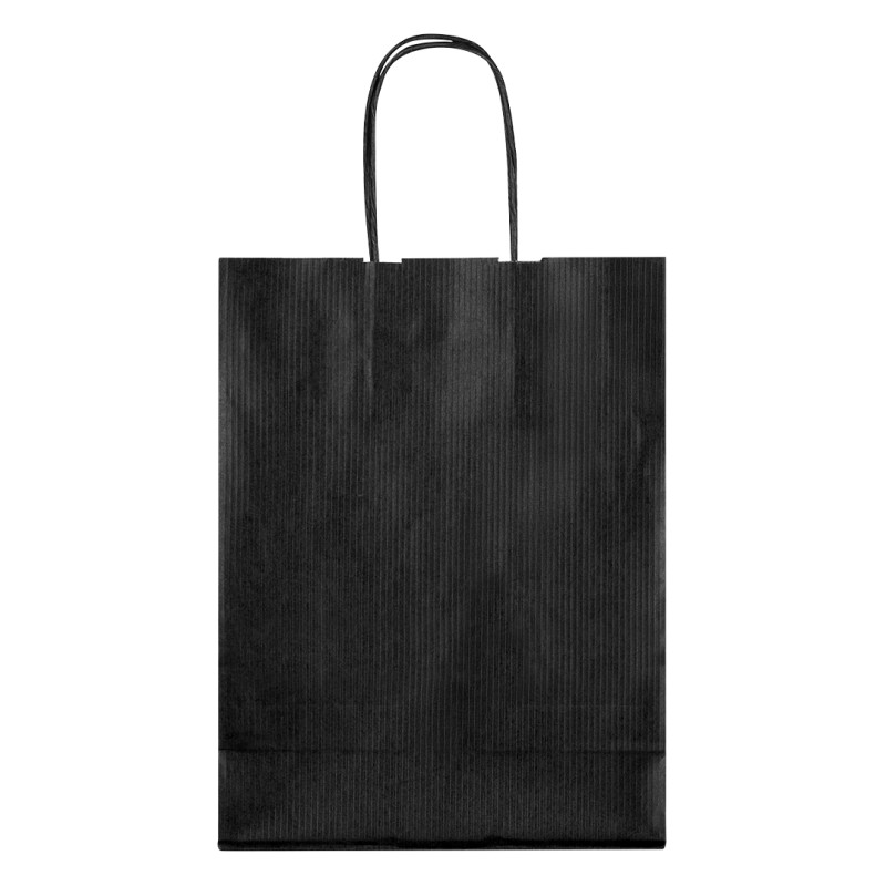 Papirna poklon kesa kompaktne veličine • Materijal: kraft papir 120 g/m2 • Diskretna prugasta tekstura • Ravno sečen gornji rub • Pletene papirne ručke u boji kese • Ojačano dno cik-cak preklopom • Pogodna za retail i manja poklon pakovanja • FSC sertifikat