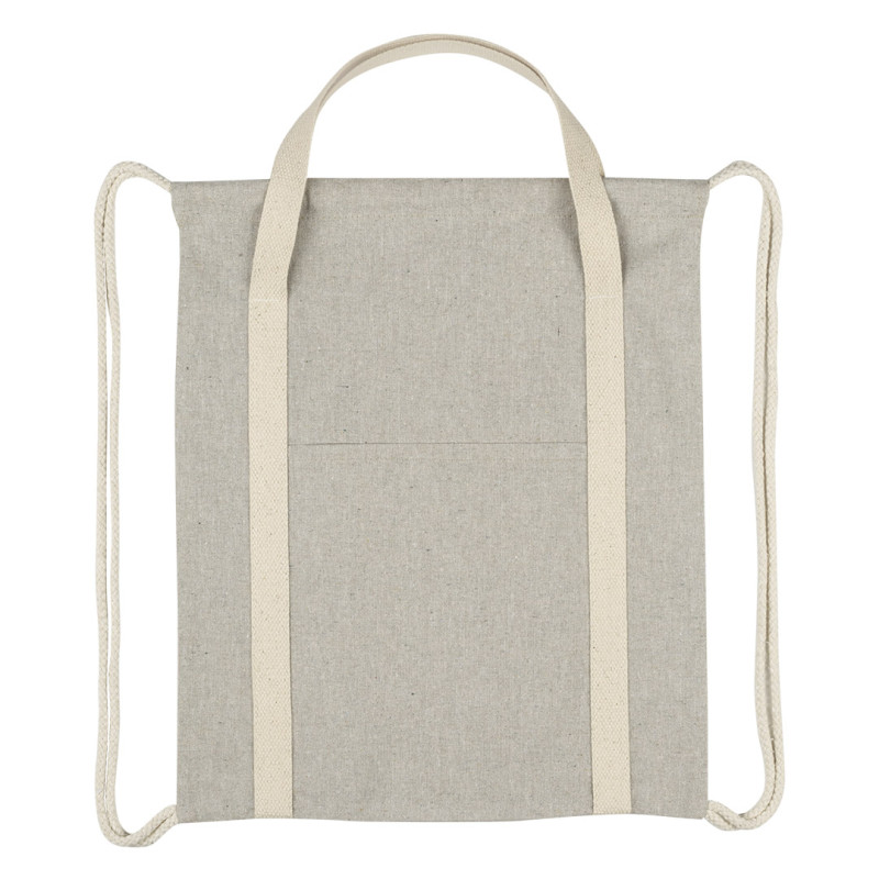 Sportski ranac sa učkurima • Sirovinski sastav: 80% reciklirani pamuk, 20% reciklirani poliester • Gramatura: 200 g/m2 • Melirani strukturirani izgled • Prednji džep pogodan za brendiranje • Kratke ručke za nošenje u ruci • Standardna veličina • Bočni šavovi • Kraft hang tag etiketa • Vezena eco etiketa • GRS sertifikat • OEKO-TEX sertifikat • FAIRTRADE sertifikat