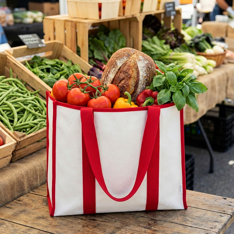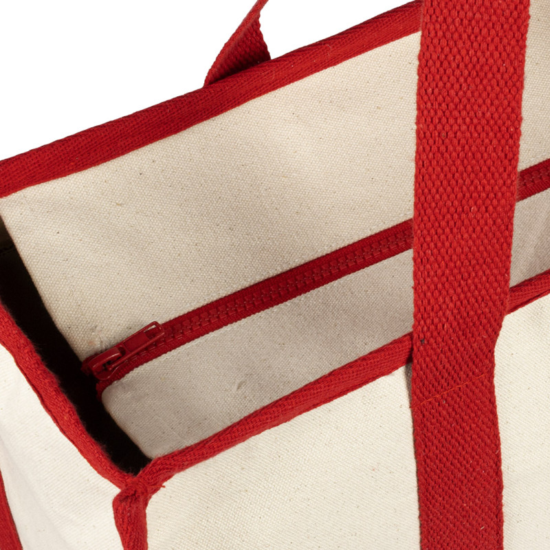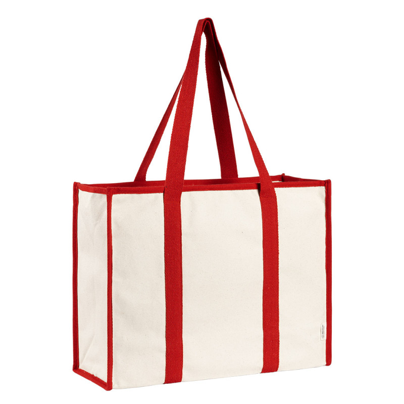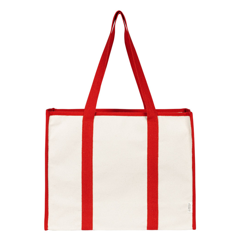 Materijal80% reciklirani pamuk, 20% reciklirani poliester • Gramatura: 450 g/m2 • Ojačana konstrukcija za veća opterećenja • Ručke prošivene oko celog tela torbe • Kontrastni detalji za moderan izgled • Zatvaranje rajsferšlusom • Unutrašnji džep • Pogodna za premium događaje i promotivne kampanje • GRS sertifikat • OEKO-TEX sertifikat • FAIRTRADE sertifik Materijal: reciklirani pamuk i reciklirani poliester
