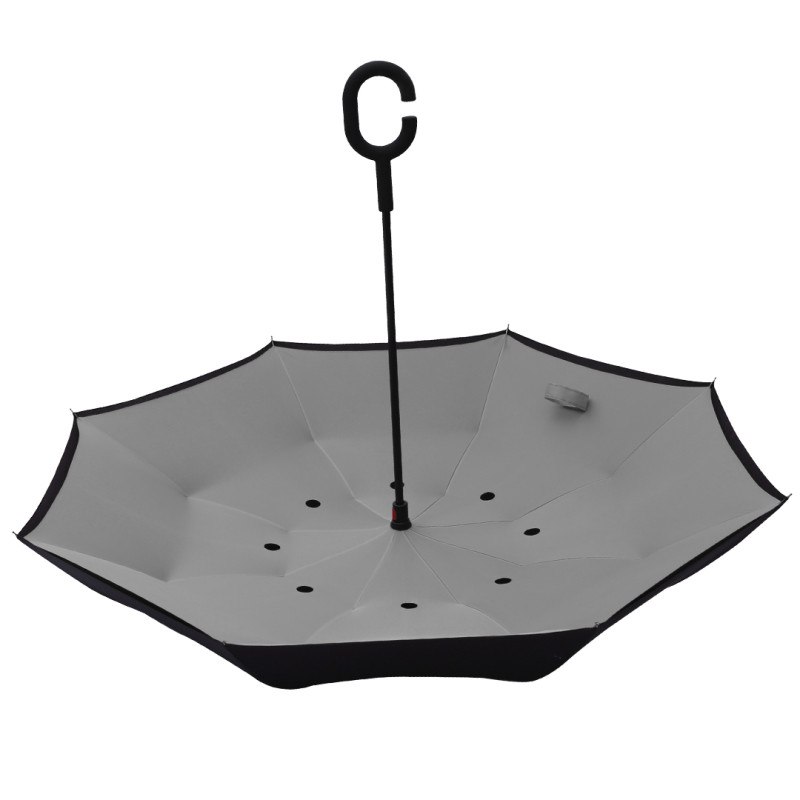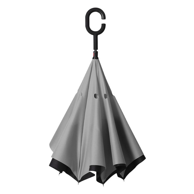 Kišobran sa obrnutim (reverse) sklapanjem predstavlja inovativan i praktičan promotivni proizvod, osmišljen za svakodnevnu upotrebu u urbanom okruženju. Ručno otvaranje u kombinaciji sa dvoslojnim 190T pongee materijalom omogućava efikasno zadržavanje vode unutar kišobrana prilikom sklapanja, čime se sprečava kvašenje poda, automobila ili odeće. Konstrukcija sa čeličnim štapom obloženim plastikom i metalnim završecima rebara obezbeđuje stabilnost i dugotrajnost. Posebno dizajnirana C-drška sa soft touch obradom omogućava nošenje bez upotrebe šaka, dok funkcija samostalnog stajanja dodatno povećava praktičnost ovog modela, čineći ga odličnim izborom za poslovne i promotivne kampanje pogodne za brendiranje. Ključne karakteristike: Kišobran sa obrnutim sklapanjem • Ručno otvaranje • 23" kišobran • 8 rebara • Dvoslojni 190T pongee materijal • Čelični štap obložen plastikom ? 12 mm • Metalni završeci rebara • Soft touch C-drška • Samostojeći dizajn • Pogodno za brendiranje