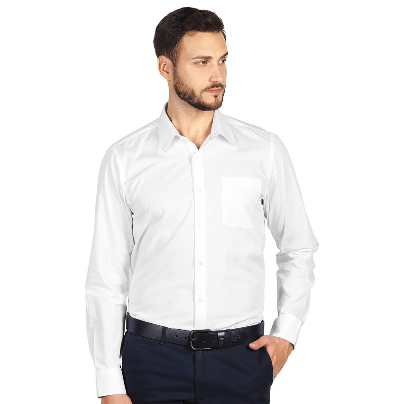 Muška košulja, klasičan kroj, sa lajsnom, džep sa leve strane grudi, sedam dugmadi napred, tri dugmeta na manžetnama, rezervna dugmad, sva dugmad u boji košulje, lako peglanje i održavanje