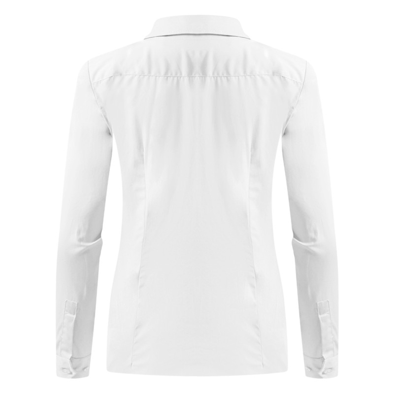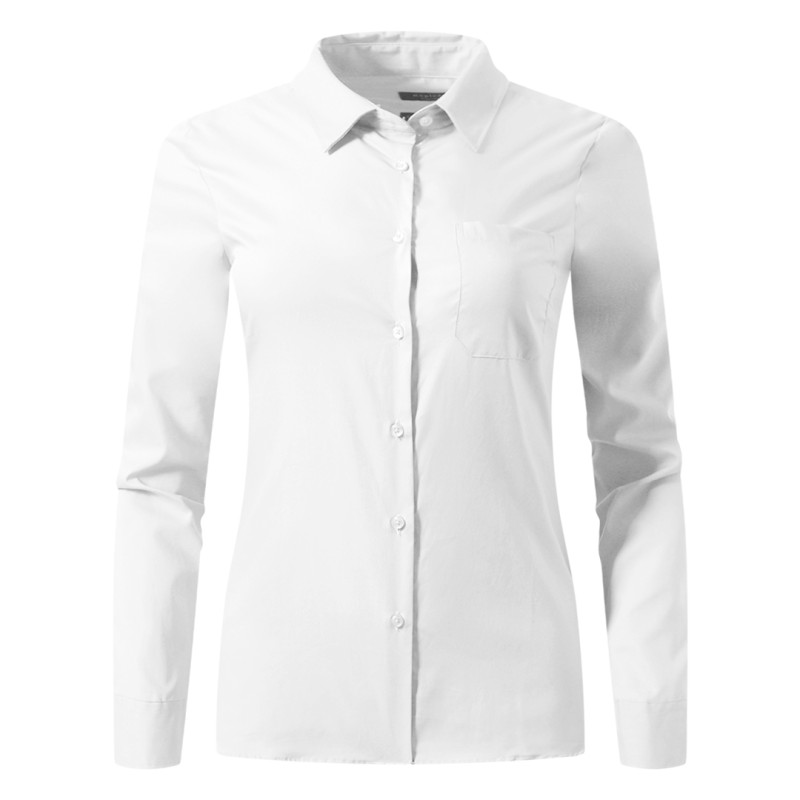 Ženska poslovna košulja dugih rukava klasičnog, blago strukiranog kroja, namenjena profesionalnoj upotrebi i svakodnevnom poslovnom stilu. Izrađena je od puplina (65% poliester, 35% pamuk, 120 g/m2), što omogućava lako održavanje, izrazito jednostavno peglanje i udobnost tokom celog dana. Materijal se minimalno gužva zahvaljujući specifičnom sastavu i završnoj obradi. Košulja ima džep na levoj strani grudi, sedam dugmadi napred, manžetne sa dva dugmeta i rezervna dugmad, sve u boji košulje. Pogodna je za brendiranje, a materijal omogućava i sublimacionu štampu. Ključne karakteristike: Ženska poslovna košulja dugih rukava • Klasičan, blago strukiran kroj • Materijal: puplin (65% poliester, 35% pamuk) • Gramatura 120 g/m2 • Minimalno gužvanje i lako peglanje • Sedam dugmadi napred u tonu košulje • Manžetne sa dva dugmeta • Džep na levoj strani grudi • Rezervna dugmad uključena • Pogodna za brendiranje • Pogodna za sublimaciju • Dostupna i u muškoj verziji
