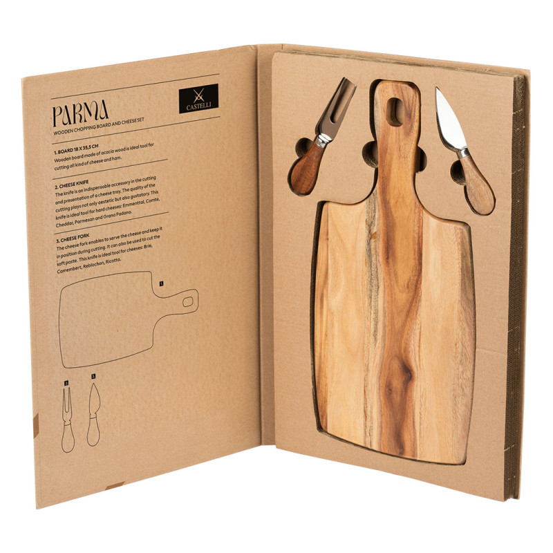 PARMA set za sireve osmišljen je kao idealan promotivni poklon za sve uživaoce dobrog sira i delikatesa. Set sadrži drvenu dasku namenjenu sečenju i serviranju, kao i dva noža prilagođena radu sa različitim vrstama tvrdih i mekih sireva. Daska je izrađena od drveta i pogodna je za personalizaciju laserskom gravurom, dok se noževi vizuelno i funkcionalno uklapaju u celinu seta. Proizvod dolazi u poklon pakovanju sa uputstvom sa unutrašnje strane i diskretnom štampom na spoljašnjoj strani, pri čemu se kutija može dodatno brendirati. PARMA set predstavlja kvalitetno rešenje za korporativne poklone, vinarije, gastro kampanje i promocije sa naglaskom na uživanje i deljenje. Ključne karakteristike: Materijal: drvo (daska), nerđajući čelik (noževi) • Sadržaj seta: drvena daska i 2 noža za tvrde i meke sireve • Namena: sečenje i serviranje sireva i delikatesa • Poklon pakovanje