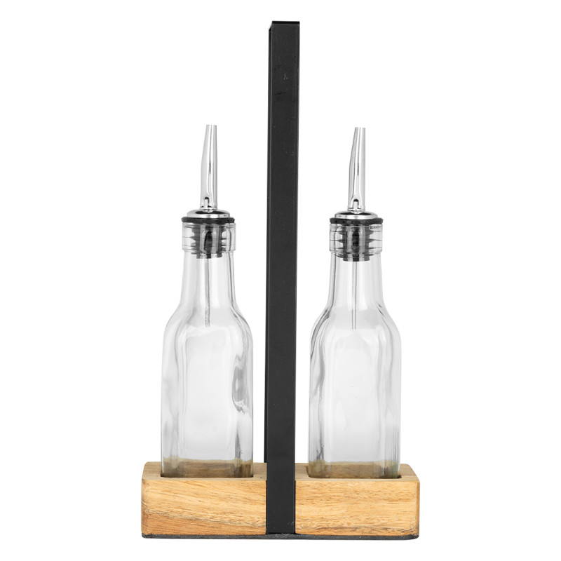 Materijal: staklo (bočice), drvo (podloga), nerđajući čelik (drška) • Sadržaj seta: bočice za ulje i sirće sa drvenom podlogom • Namena: serviranje ulja i sirćeta • Poklon pakovanje