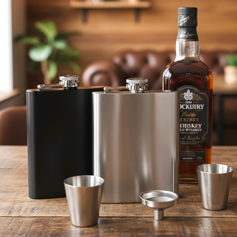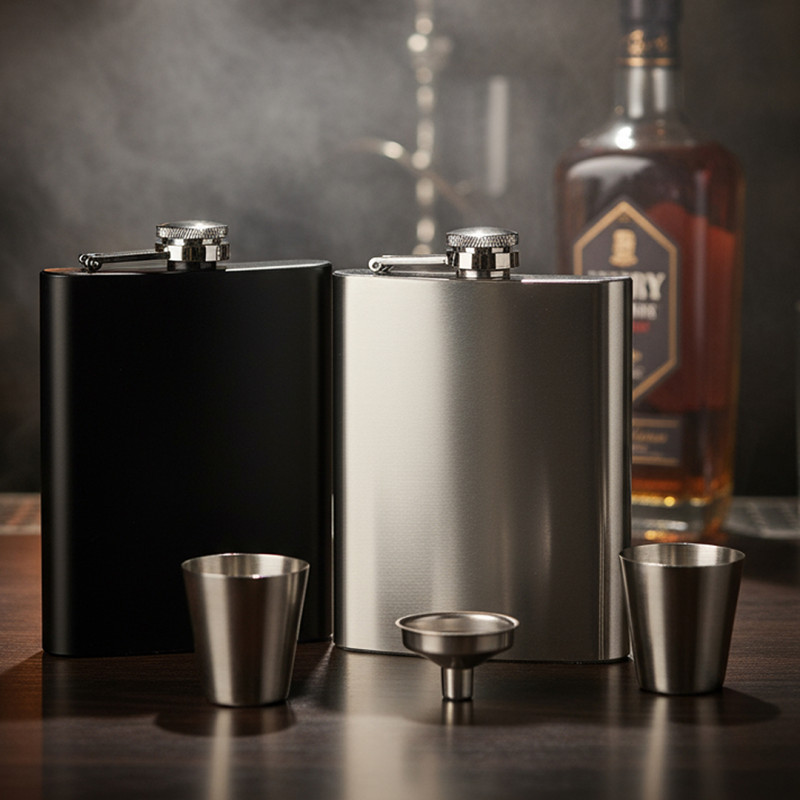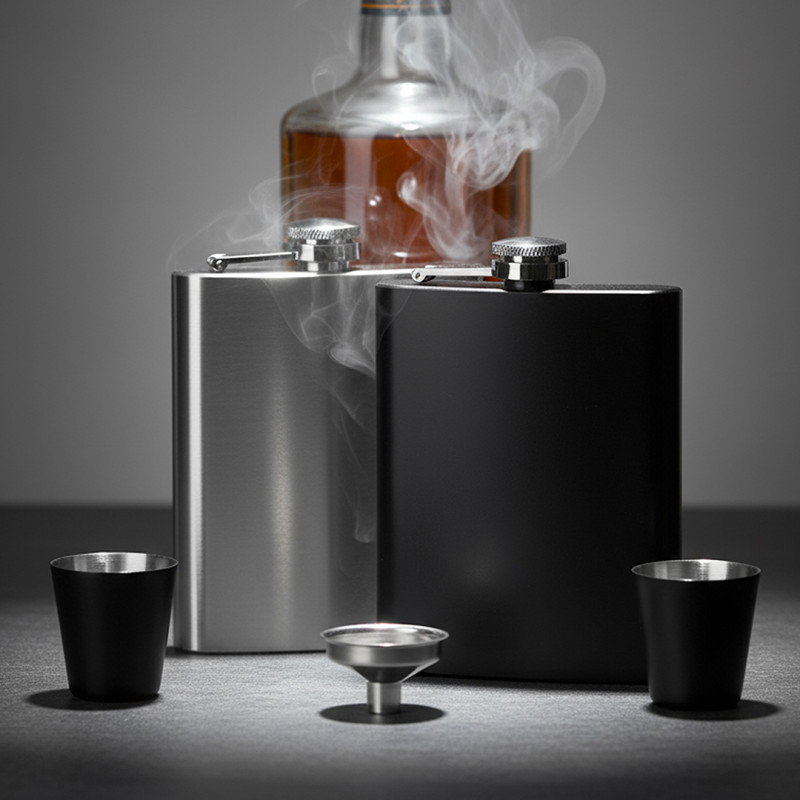 Materijalnerđajući čelik kvaliteta 304 • Konstrukcija: jednostruki zid • Kapacitet: 230 ml • Set sadrži: pljosku, 2 čašice i levak • Poklon