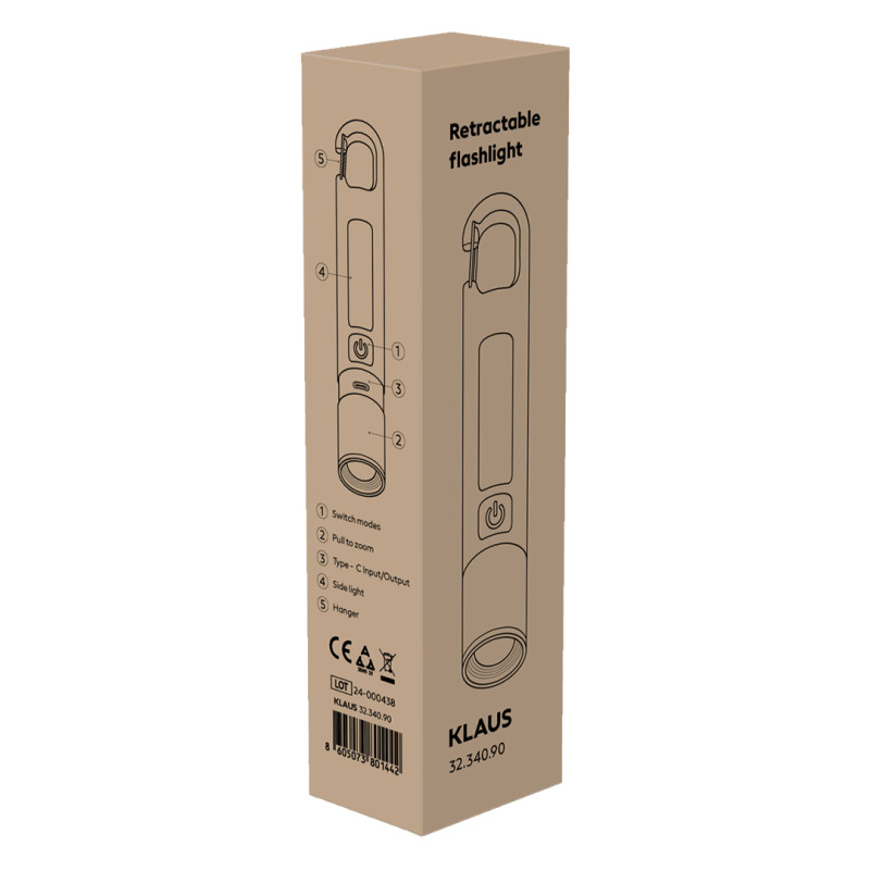 KLAUS je punjiva baterijska lampa dizajnirana za korisnike kojima su potrebni snažno osvetljenje, fleksibilnost i praktično nošenje u svakodnevnim i outdoor uslovima. Opremljena je sa 8 LED lampica, dodatnim bočnim svetlom, tri režima rada svetlosti i zoom funkcijom, što omogućava prilagođavanje osvetljenja različitim situacijama. Svetlosni snop jačine 140 lumena dostiže domet do 60 metara, dok ugrađena baterija kapaciteta 1200 mAh obezbeđuje pouzdanu upotrebu bez česte potrebe za punjenjem. Lampa se puni na praktičan način – povlačenjem plastičnog dela, gde se nalazi Type-C konektor. Dodatnu praktičnost pruža karabinjer sa otvaranjem, koji omogućava lako kačenje za kaiš, ranac ili ključeve. KLAUS dolazi u poklon kutiji i predstavlja funkcionalan poslovni poklon i promotivni proizvod. Ključne karakteristike: Materijal: plastika • 8 LED sijalica • Bočno svetlo • Snaga: 140 lumena • Domet osvetljenja do 60 m • Tri režima rada • Zoom funkcija • Baterija kapaciteta 1200 mAh • Type-C konektor • Karabinjer za kačenje • Poklon pakovanje