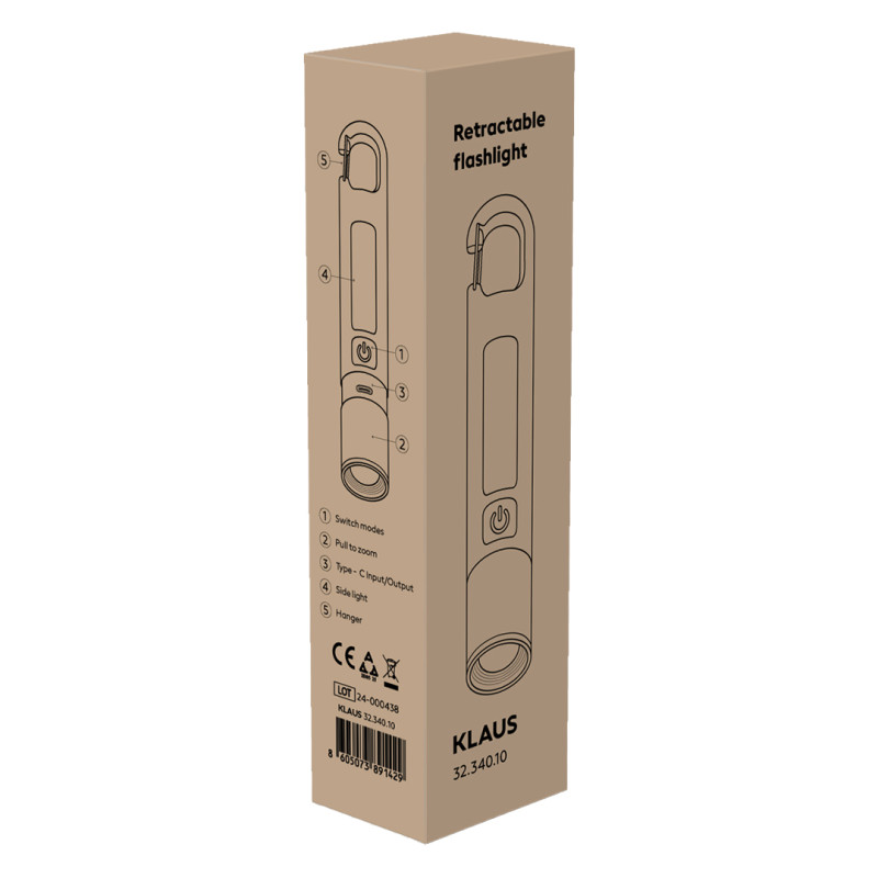 KLAUS je punjiva baterijska lampa dizajnirana za korisnike kojima su potrebni snažno osvetljenje, fleksibilnost i praktično nošenje u svakodnevnim i outdoor uslovima. Opremljena je sa 8 LED lampica, dodatnim bočnim svetlom, tri režima rada svetlosti i zoom funkcijom, što omogućava prilagođavanje osvetljenja različitim situacijama. Svetlosni snop jačine 140 lumena dostiže domet do 60 metara, dok ugrađena baterija kapaciteta 1200 mAh obezbeđuje pouzdanu upotrebu bez česte potrebe za punjenjem. Lampa se puni na praktičan način – povlačenjem plastičnog dela, gde se nalazi Type-C konektor. Dodatnu praktičnost pruža karabinjer sa otvaranjem, koji omogućava lako kačenje za kaiš, ranac ili ključeve. KLAUS dolazi u poklon kutiji i predstavlja funkcionalan poslovni poklon i promotivni proizvod.