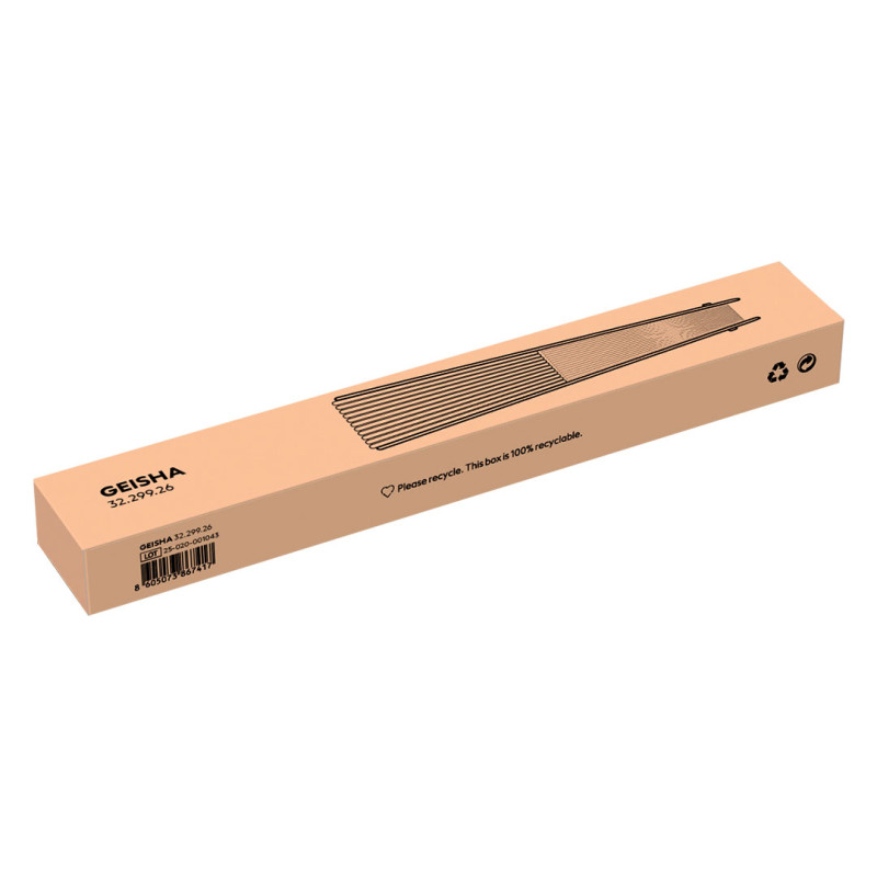 GEISHA je vodeći model u našoj kolekciji lepeza, izrađena od poliestera sa drvenom drškom koja je pogodna za lasersku gravuru - omogućavajući elegantno i trajno brendiranje. Njena široka paleta boja i sofisticirani dizajn čine je izuzetno atraktivnim promotivnim i korporativnim poklonom za letnje događaje, sajmove, team buildinge i druge aktivnosti na otvorenom. Dolazi u poklon kutiji, spremna za poklanjanje i prezentaciju brenda. Ključne karakteristike: Materijal: poliester i drvo • Poklon pakovanje