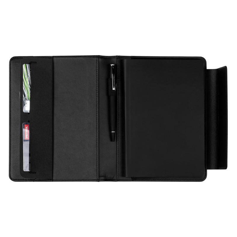 Portfolio sa notesom formata A5, namenjen reprezentativnoj poslovnoj i promotivnoj upotrebi. Luksuzna obloga sa imitacijom kože daje profesionalan izgled, dok dodatni džepovi za kartice i dokumenta i držač za olovku omogućavaju dobru organizaciju. Notes sadrži knjižni blok u linije sa 128 strana krem papira gramature 80 g/m². Proizvod dolazi upakovan u poklon kutiji, što ga čini pogodnim za poslovne i premium promotivne poklone.