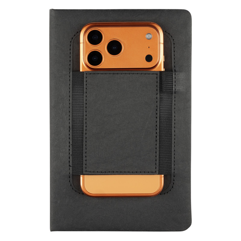 Notes formata A5 sa zaobljenim ivicama, dizajniran kao praktičan promotivni proizvod za svakodnevnu upotrebu. Opremljen je držačem za olovku i džepom za mobilni telefon na prednjoj strani korice, što ga čini funkcionalnim dodatkom za kancelariju, sastanke ili putovanja. Korica je izrađena od perivog papira (washed kraft), dok knjižni blok od recikliranog papira u linije sa krem papirom omogućava prijatno i uredno vođenje beleški. Pogodan je za brendiranje i promotivne kampanje sa naglaskom na održive materijale.