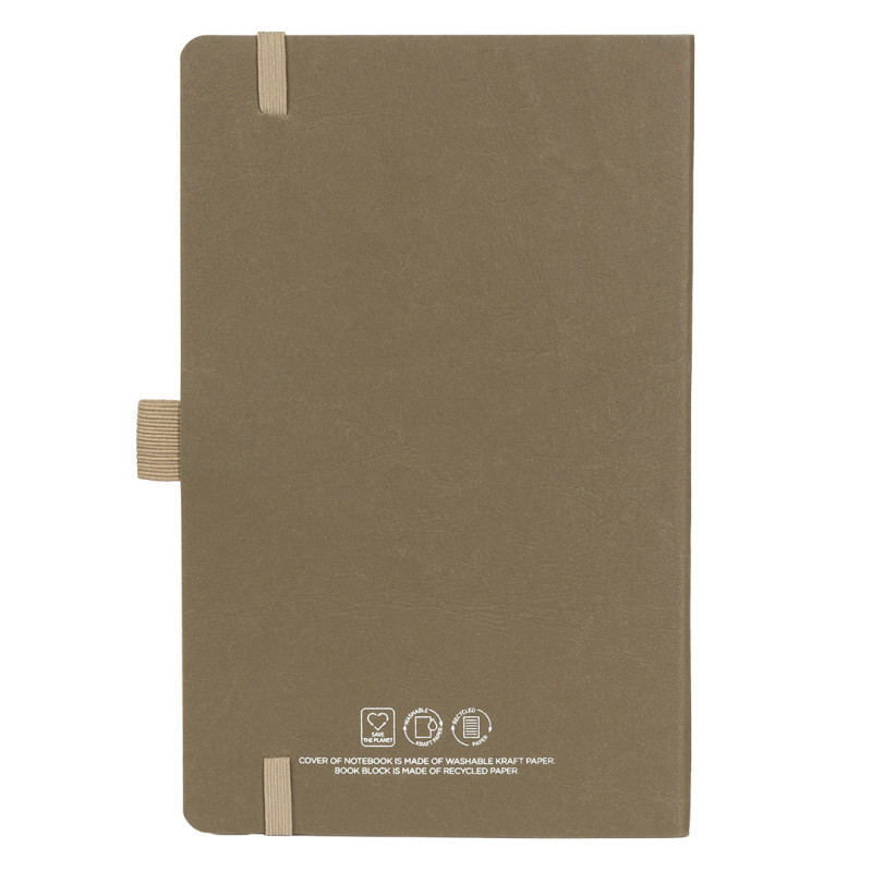 Notes formata A5 sa zaobljenim ivicama, dizajniran kao praktičan promotivni proizvod za svakodnevnu upotrebu. Opremljen je elastičnom trakom i držačem za olovku, što omogućava uredno i sigurno nošenje. Savitljiva korica izrađena je od perivog papira (washed kraft), dok je unutrašnji knjižni blok od recikliranog papira. Knjižni blok u linije sa 160 strana krem papira gramature 70 g/m² pogodan je za beleške, planiranje i promotivne kampanje sa naglaskom na održivost. Ključne karakteristike: Notes • Format A5 • 160 strana • Knjižni blok u linije • Krem papir 70 g/m² • Knjižni blok od recikliranog papira • Savitljiva korica od perivog papira (washed kraft) • Zaobljene ivice • Elastična traka • Držač za olovku