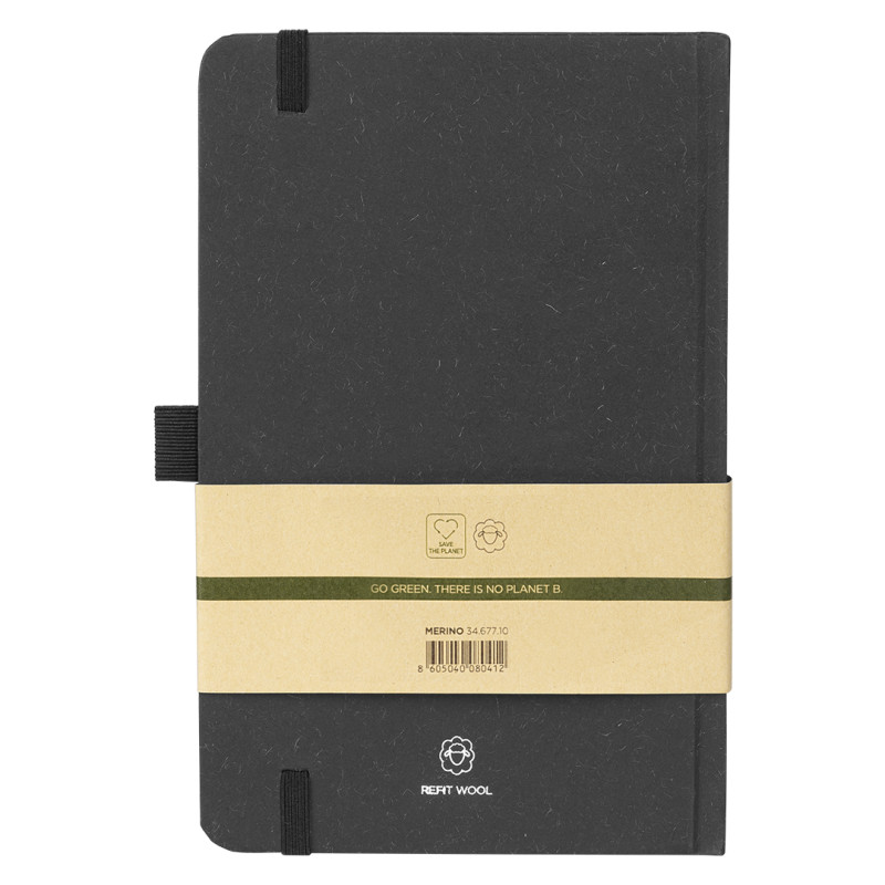 Notes • Format A5 • 160 strana • Knjižni blok u linije • Krem papir 70 g/m² • Eco-friendly dizajn • Korica od mešavine papira i 15% prerađene vune (FAVINI) • Zaobljene ivice • Elastična traka • Držač za olovku