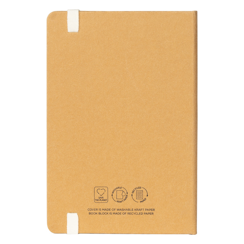 Notes formata A5 sa zaobljenim ivicama i elastičnom trakom, dizajniran kao ekološki orijentisan promotivni proizvod. Korica je izrađena od perivog papira (washed kraft), dok je unutrašnji knjižni blok od recikliranog papira, što ga čini pogodnim za kampanje sa naglaskom na održivost. Knjižni blok u linije sa 160 strana krem papira gramature 80 g/m² omogućava uredno i prijatno vođenje beleški.