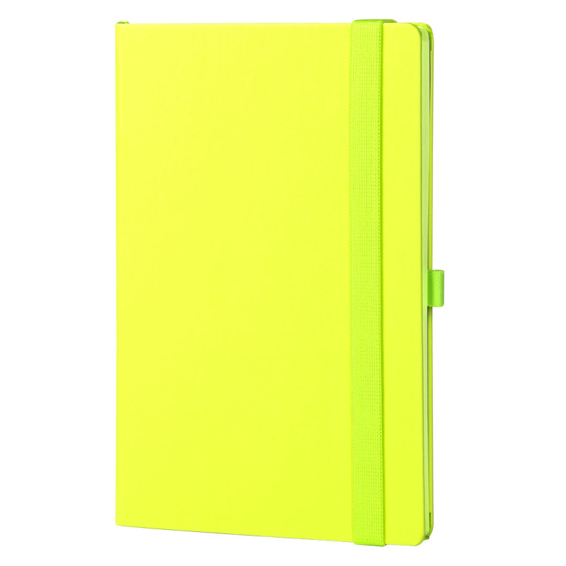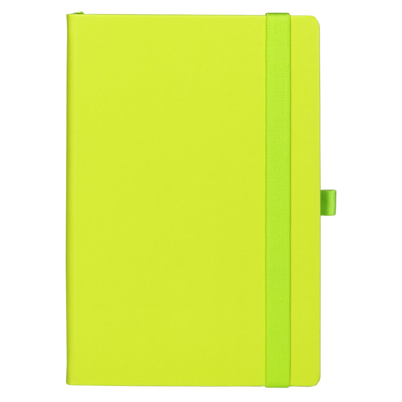 Notes formata A5 sa zaobljenim ivicama i dodatnim dizajnerskim detaljima, prilagođen promotivnoj i poslovnoj primeni. Bojena ivica knjižnog bloka u boji korice doprinosi ujednačenom i profesionalnom izgledu. Notes je opremljen elastičnom trakom, držačem za olovku i džepom na unutrašnjoj strani zadnje Korica. Knjižni blok u linije sa 192 strane belog papira gramature 80 g/m² omogućava uredno vođenje beleški. Proizveden u Evropi.
