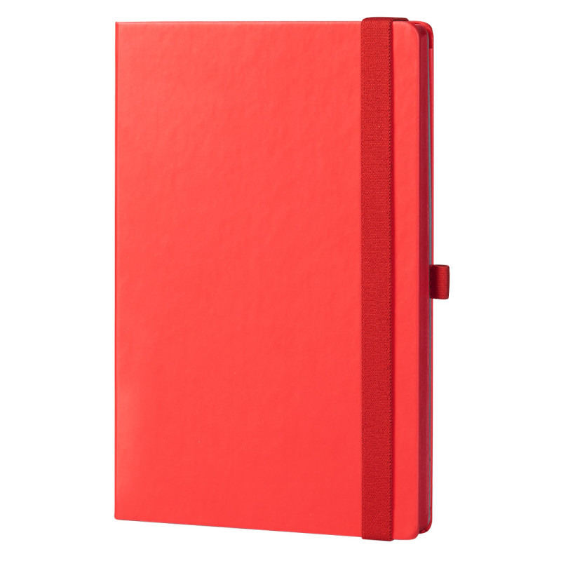 Dodacipredlist sa poljima za upisivanje ličnih podataka, bojena ivica knjižnog bloka, elastična traka, držač za olovku, džep na unutrašnjoj strani zadnje korice i bojena nitna u boji korice