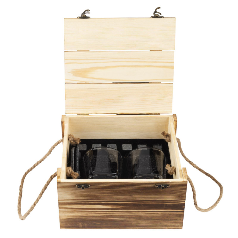 Materijal: drvo (kutija), staklo (čaše), slate kamen (kocke i podmetači), metal (hvataljka) • Sadržaj seta: 2 staklene čaše, 2 kamena podmetača, 6 kamenih kocki za led, hvataljka za led • Kutija: drvena kutija sa kanap ručkama i metalnom kopčom • Poklon pakovanje
