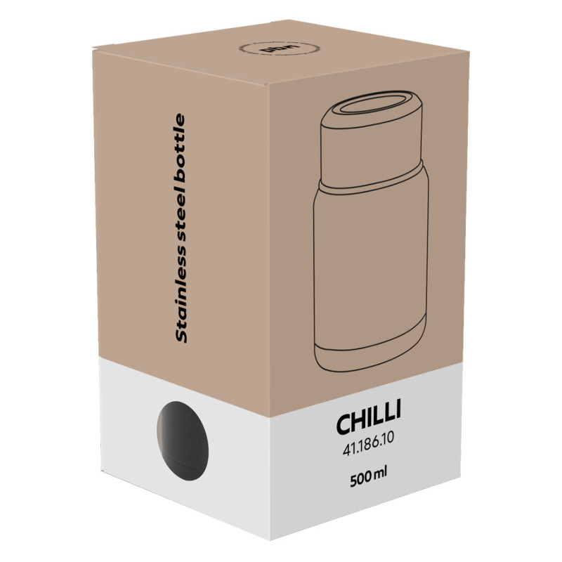 CHILLI termo posuda za hranu kapaciteta 500 ml predstavlja praktično rešenje za nošenje obroka van kuće. Izrađena je od nerđajućeg čelika i poseduje vakuumsku izolaciju sa dvostrukim zidom, zahvaljujući kojoj hrana duže zadržava temperaturu, što je čini idealnom za putovanja, izlete, posao ili školu. Poklopac je dizajniran tako da sigurno sprečava prosipanje sadržaja, dok se unutar posude nalazi sklopiva kašika koja omogućava jednostavno korišćenje obroka u pokretu. Kompaktna forma i funkcionalan dizajn čine ovu posudu pogodnom za svakodnevnu upotrebu i promotivne kampanje povezane sa aktivnim životnim stilom.