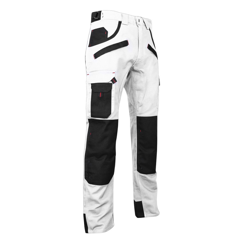 Radne pantalone, 300g/m2 platno prepletaj, ojačanja od 900D poliestera na mestima izloženim većem habanju (džepovi, kolena), džepovi za umetanje štitnika za kolena, četiri prednja džepa (dva sa rajsferšlusom), dva džepa pozadi i dva sa strane sa praktičnim odeljcima za alat, gajka za čekić, plastične alke za ključeve, pojas sa čičak trakom za podešavanje širine u struku za dodatnu udobnost, trostruki štepovi kao ojačanje