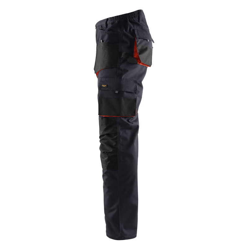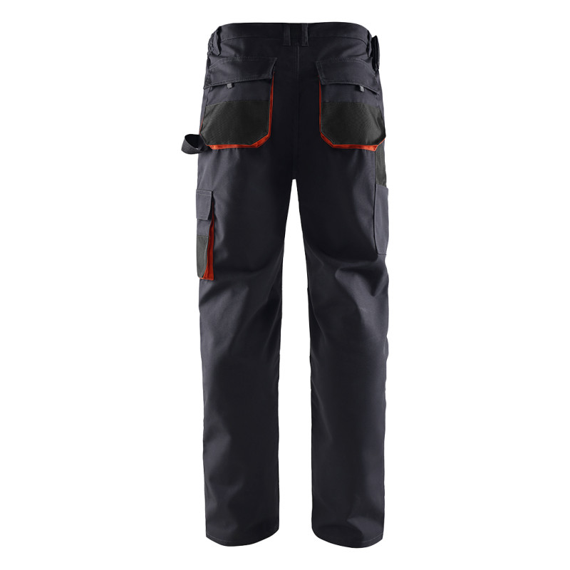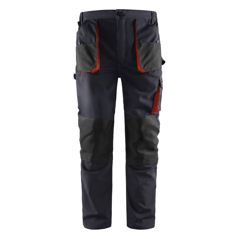 Radne pantalone • Materijal: 65% poliester, 35% pamuk • Gramatura: 270 g/m² • Ojačanja: 600D poliester (džepovi, kolena) • Elastičan pojas u struku • Džepovi: 2 prednja + 2 zadnja + 2 bočna • Džepovi za štitnike kolena • Gajka za čekić • Plastična alka za ključeve • Reflektivni detalji • Trostruki štepovi i ringlice • Unutrašnja etiketa za lične podatke • SAB rajsferšlusi