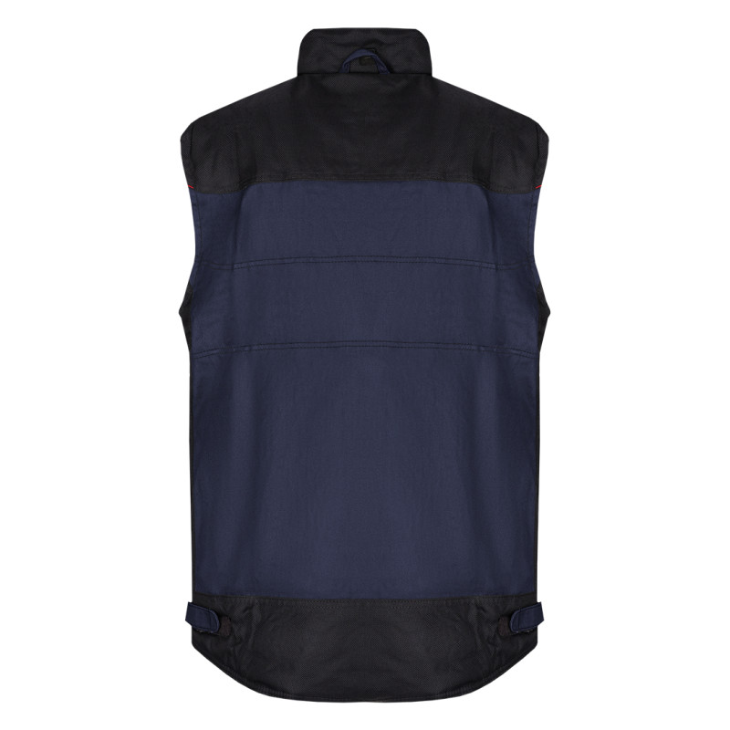 Radni prsluk, 300 g/m2, platno prepletaj, visoka kragna, ojačanja od 900D poliestera na mestima izloženim većem habanju, dva džepa na grudima uključujući odeljak za identifikacionu karticu, dva prednja džepa, jedan unutrašnji džep, čičak trake na dnu za podešavanje širine u struku, skriveni unutrašnji rajsferšlus na leđima za lakši pristup prilikom štampanja
