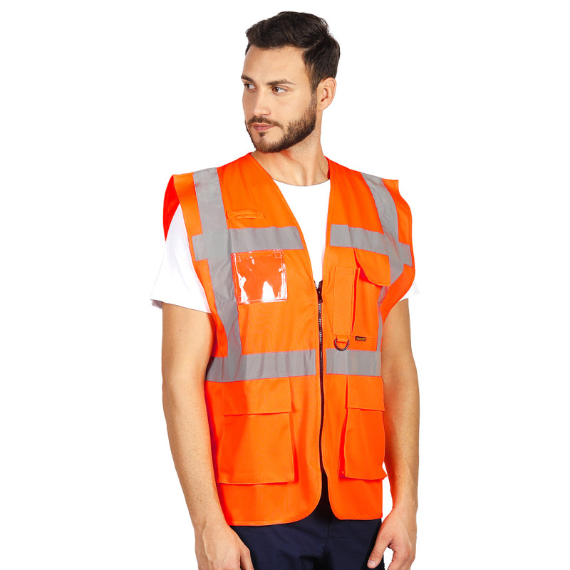 Prsluk je opremljen reflektivnim trakama postavljenim dve napred, dve pozadi i jednom preko ramena, što omogućava dobru uočljivost iz više pravaca u uslovima slabijeg osvetljenja. Funkcionalna konstrukcija uključuje četiri prednja džepa, uključujući džep za mobilni telefon i olovku, kao i plastični uložak za ID karticu. Dodatne plastične gajke za ključeve i slušalice omogućavaju praktično nošenje sitne opreme. Pogodan je za saobraćaj, logistiku, skladišta, komunalne delatnosti, događaje i druga okruženja gde je potrebna osnovna vidljivost i organizacija radne opreme.
