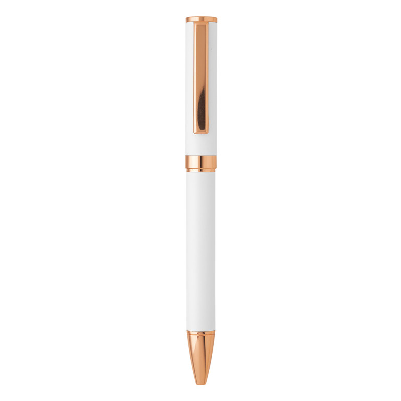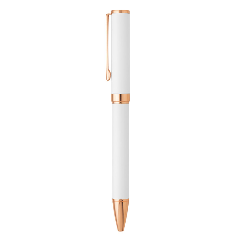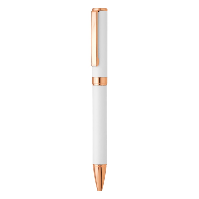Hemijska olovka u setu SFINGA je luksuzan promotivni model izrađen od mesinga, sa pažljivo kombinovanim metalnim i prirodnim elementima. Twist mehanizam omogućava jednostavno i pouzdano korišćenje, dok TC kuglica debljine 0,7 mm obezbeđuje glatko i precizno pisanje uz plavo mastilo koje zadovoljava standardne poslovne potrebe. Mat završna obrada tela olovke sa podlogom gornjeg dela u boji klipse daje sofisticiran i skladan izgled, dok sjajni detalji u boji ružičastog zlata naglašavaju premium karakter modela. Elementi od bambusa unose prirodnu notu i dodatnu estetsku vrednost, a luksuzna poklon kutija čini SFINGA idealnim izborom za ekskluzivne poslovne poklone.