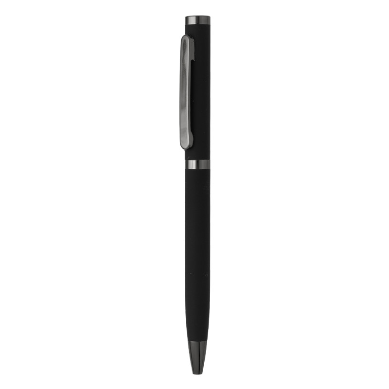 Hemijska olovka u setu AMBASADOR je luksuzan promotivni model izrađen od mesinga, namenjen premium poslovnim poklonima i reprezentativnom brendiranju. Soft touch telo sa hromiranom podlogom gornjeg dela pruža izuzetno prijatan osećaj pri držanju i sofisticiran vizuelni efekat, dok twist mehanizam omogućava jednostavno i pouzdano korišćenje. TC kuglica debljine 0,7 mm obezbeđuje glatko i precizno pisanje uz plavo mastilo koje zadovoljava standardne kancelarijske i poslovne potrebe. Sjajni tamno-metalni detalji dodatno naglašavaju elegantan karakter modela, a papirna navlaka kao dodatak za pakovanje čini ovaj proizvod praktičnim i spremnim za urednu prezentaciju.