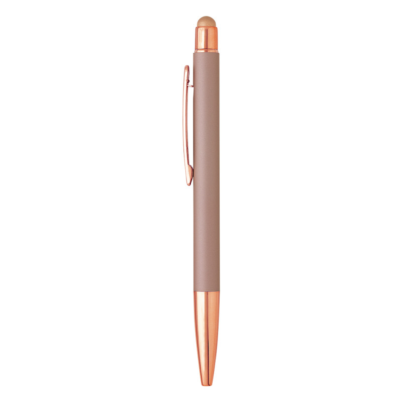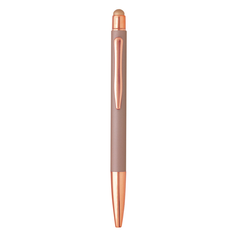 Materijalaluminijum • TC kuglica 0,7 mm • Plavo mastilo • Soft touch telo • Sjajni detalji u boji ružičastog zlata • Papirna navlaka za