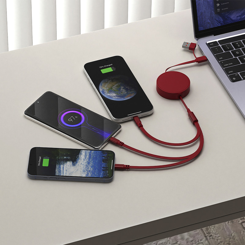 Materijalplastika, aluminijum • Dužina kabla: 1 m • Tip kabla: uvlačeći (automatsko uvlačenje) • Ulaz: USB-A/Type-C • Izlazi: Micro-USB, Lightning, Type-C • Snaga punjenja: do 60 W (Type-C/Type-C) • PD (Power Delivery) funkcija • Soft touch završna obrada • Funkcije: Punjenje i prenos podataka • Kompatibilno sa uređajima: pomoćne baterije, mobilni telefoni, tableti, laptopovi • Poklon