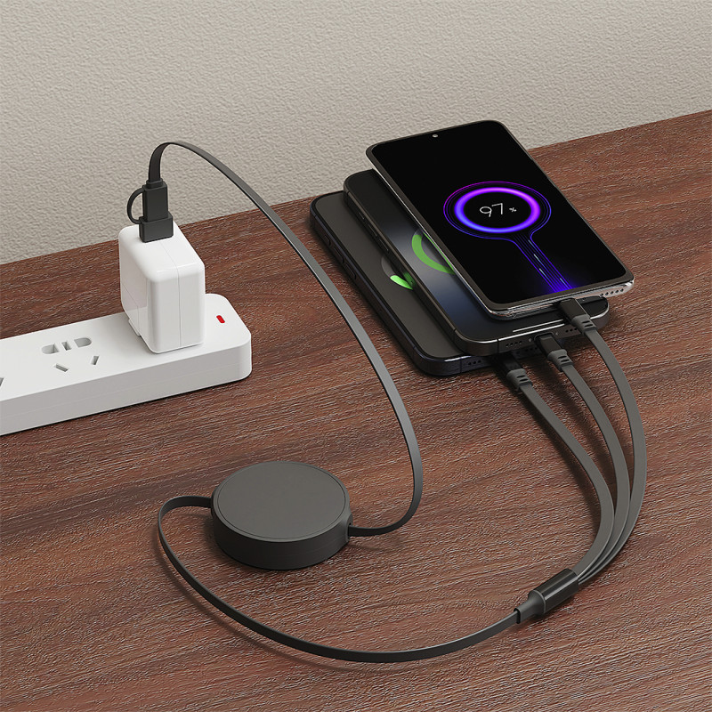Materijal: plastika, aluminijum • Dužina kabla: 1 m • Tip kabla: uvlačeći (automatsko uvlačenje) • Ulaz: USB-A/Type-C • Izlazi: Micro-USB, Lightning, Type-C • Snaga punjenja: do 60 W (Type-C/Type-C) • PD (Power Delivery) funkcija • Soft touch završna obrada • Funkcije: Punjenje i prenos podataka • Kompatibilno sa uređajima: pomoćne baterije, mobilni telefoni, tableti, laptopovi • Poklon pakovanje