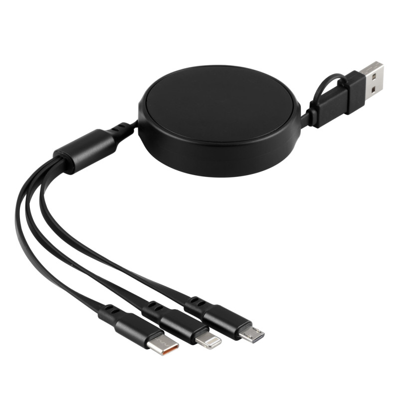 Materijalplastika, aluminijum • Dužina kabla: 1 m • Tip kabla: uvlačeći (automatsko uvlačenje) • Ulaz: USB-A/Type-C • Izlazi: Micro-USB, Lightning, Type-C • Snaga punjenja: do 60 W (Type-C/Type-C) • PD (Power Delivery) funkcija • Soft touch završna obrada • Funkcije: Punjenje i prenos podataka • Kompatibilno sa uređajima: pomoćne baterije, mobilni telefoni, tableti, laptopovi • Poklon